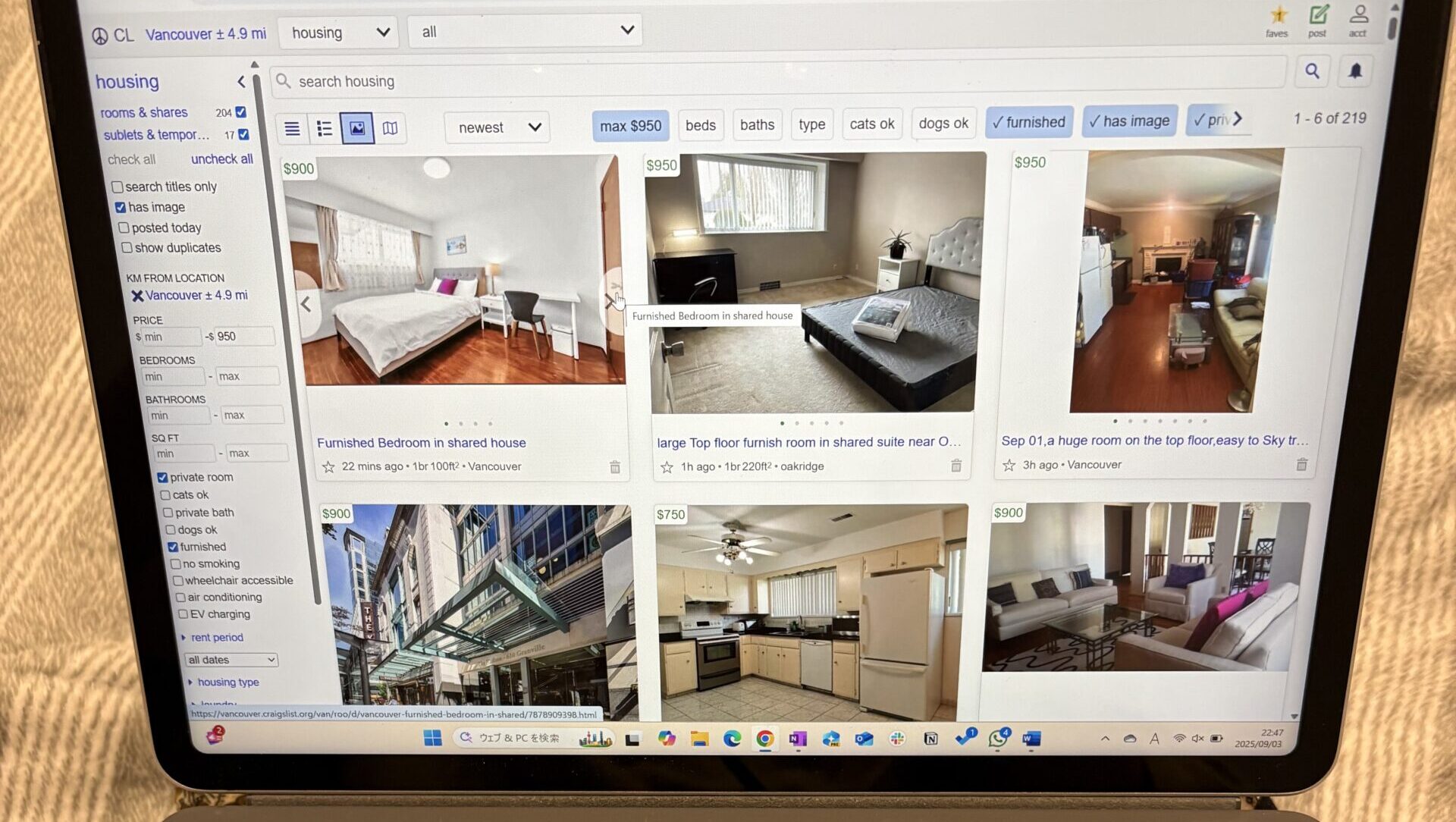 Claigslist(海外のオンライン掲示板サイト)、Facebookマーケットプレイス、JP Canada(日本人用の家探しサイト)を毎日見漁る日々でした。